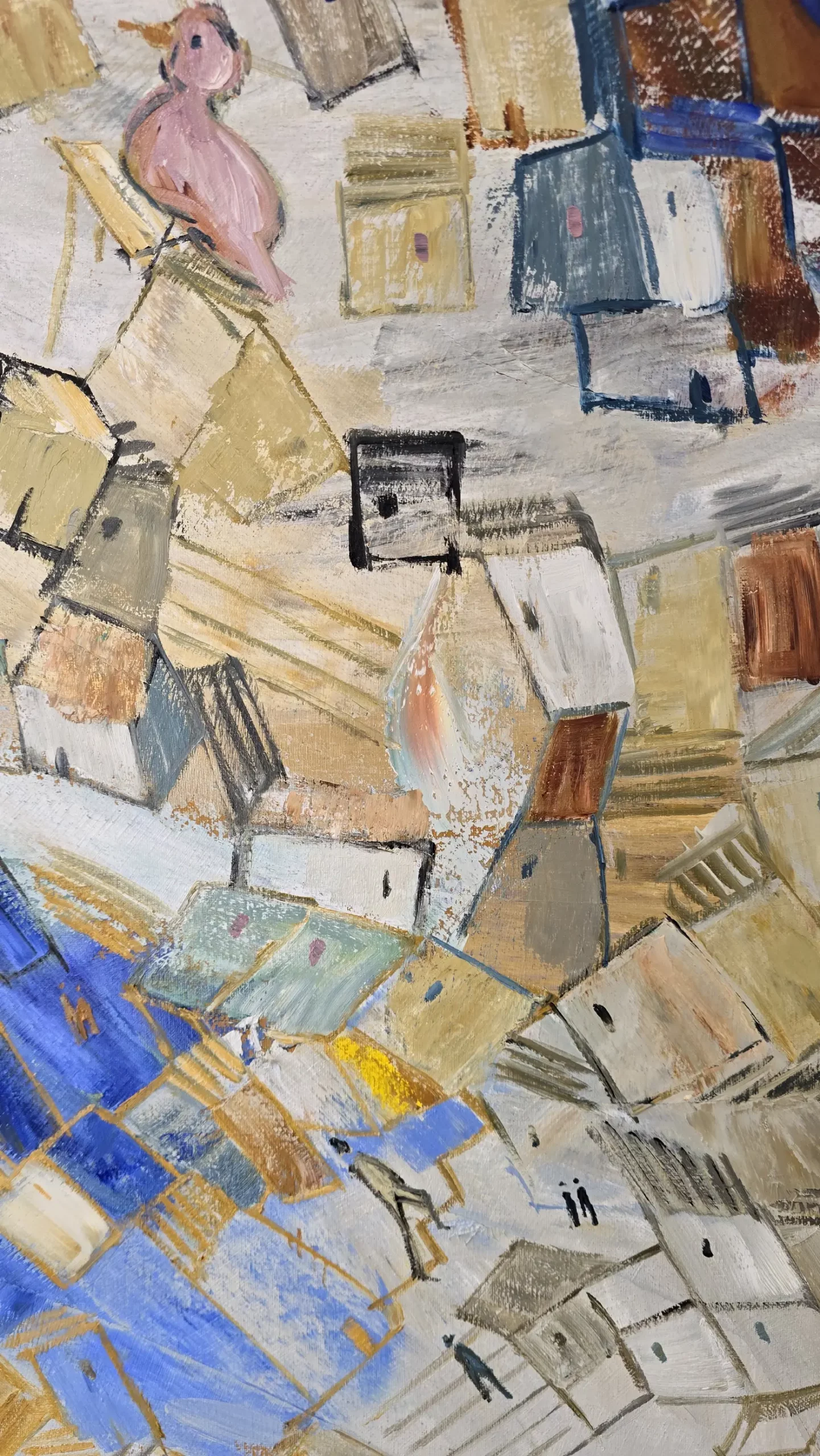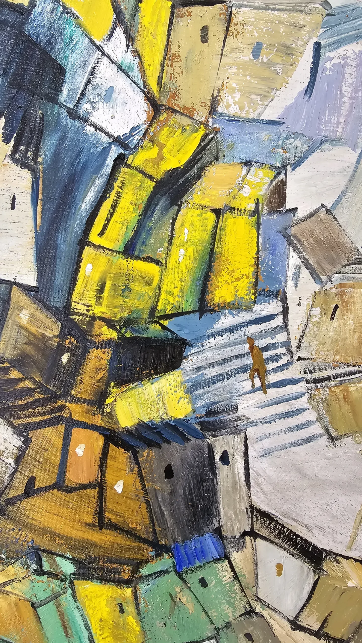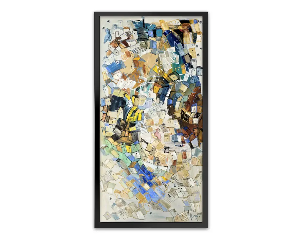 What I love about painting is that you can bring your ideas to life on the canvas. I can place the stars wherever I please, and the birds sing above the rooftops. This piece is very special, it explores a blend of colors that ultimately come together with a unifying thread, creating a sense of harmony. Dive into the details and discover something new every day.