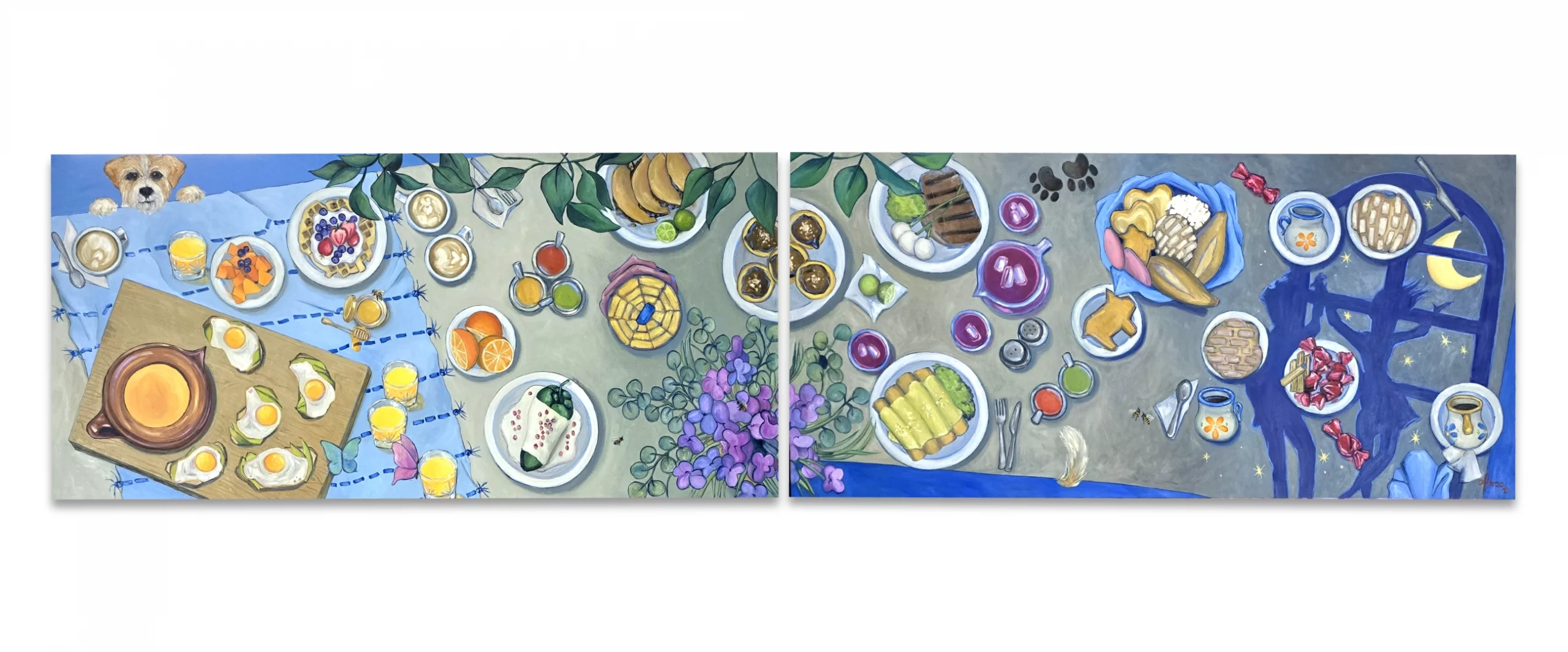 In this oil painting, time stands still in three magical moments: the intimate breakfast, the shared meal, and the romantic dinner. But it is in the dance, under the warm evening light, where the couple finds their true rhythm. A tribute to the beauty of love and human connection through food.