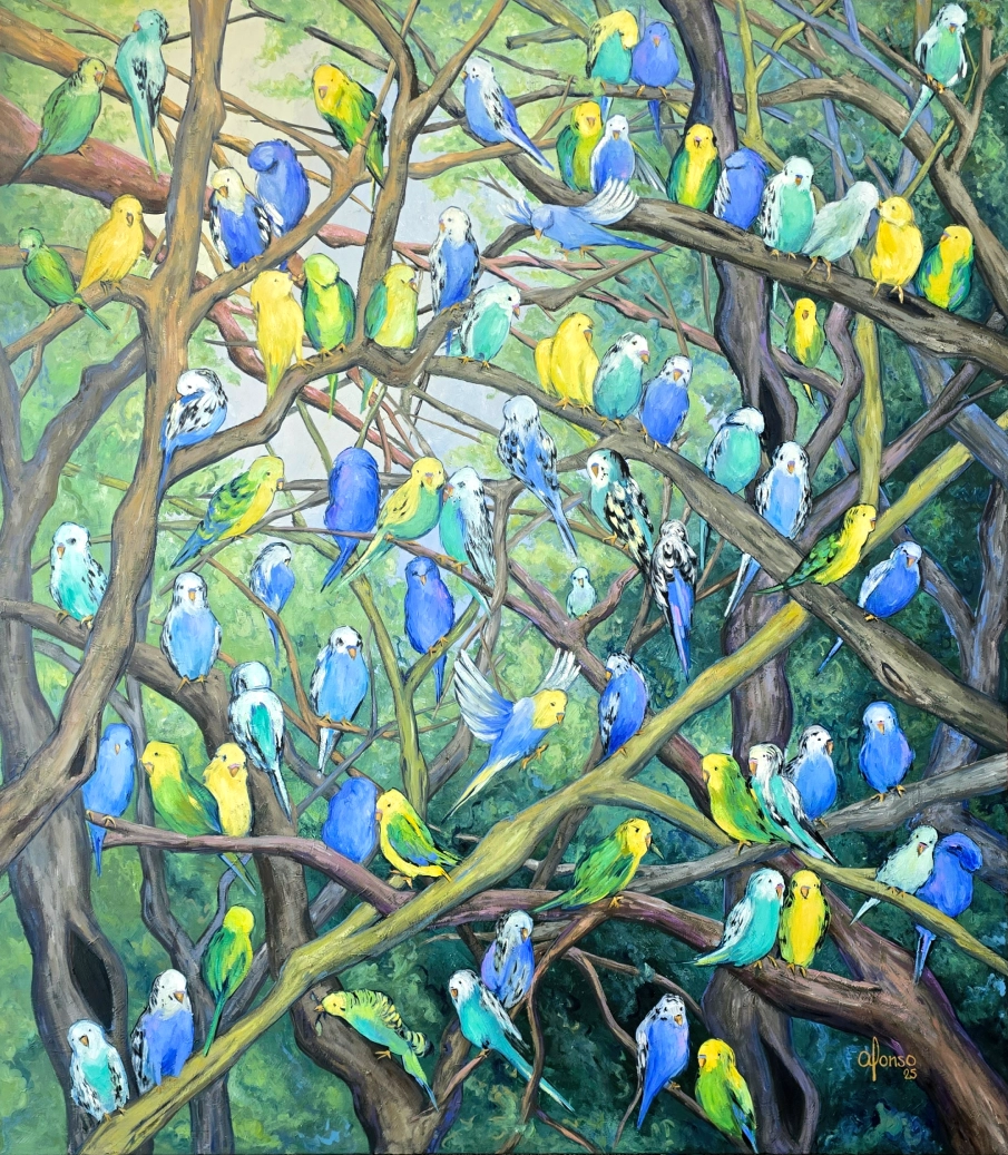 FREE WINGS is a unique piece of art that celebrates freedom as an act of respect. Within it dwell 72 birds, each one distinct and vibrant, perched on its branches like a score of suspended flight.