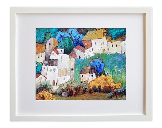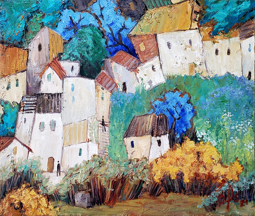 This work of art depicts a landscape enriched with vibrant textures that capture the essence of nature. The tactile richness of the painting highlights the emotional connection between the landscape and the two human figures walking, evoking a sense of adventure and exploration in this picturesque setting.