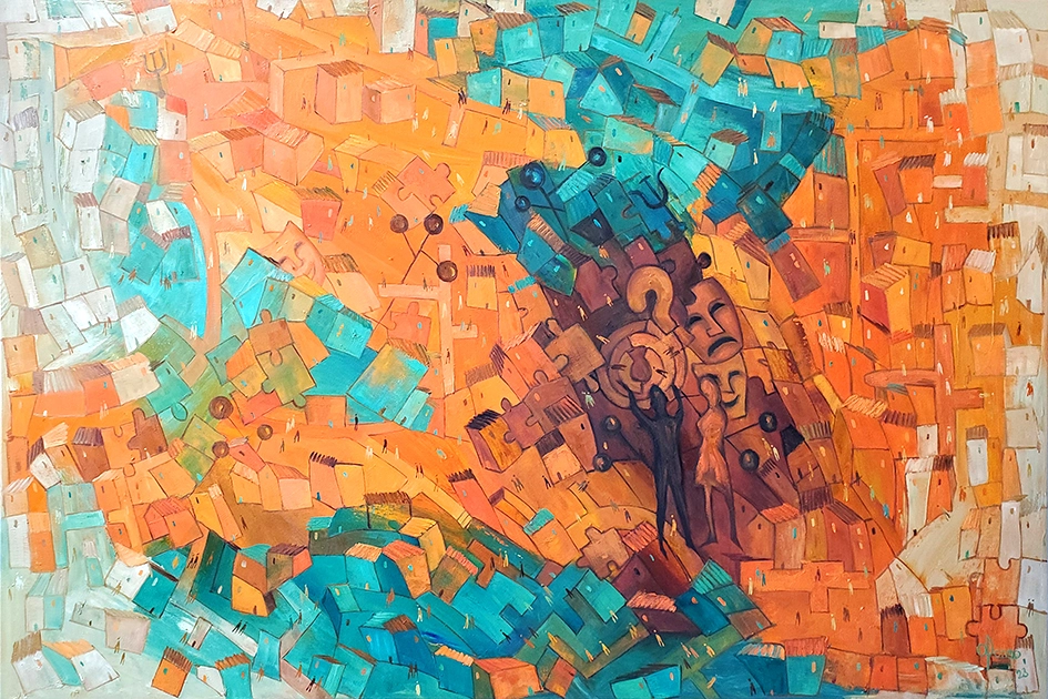 The artwork is presented as a vast labyrinth that spans the entire canvas, with closed and open paths, serving as a visual metaphor for the inner journey or the process of self-discovery that an individual undergoes in a therapeutic process.