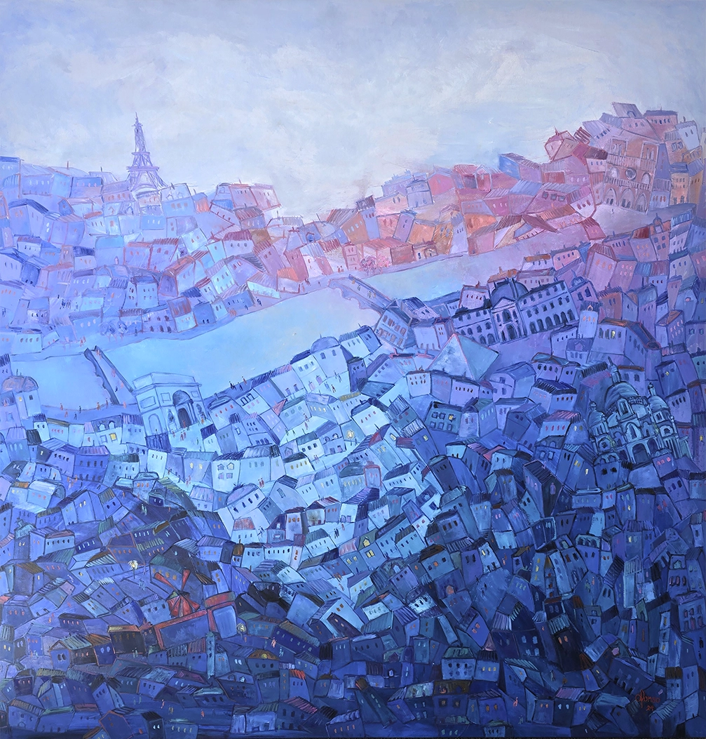 The iconic Moulin Rouge adds a touch of bohemia, and the Sacred Heart is seen in the distance. Each brushstroke vibrates with the life and movement of a city that never sleeps, inviting the viewer to immerse themselves in the magical experience of a night in Paris.