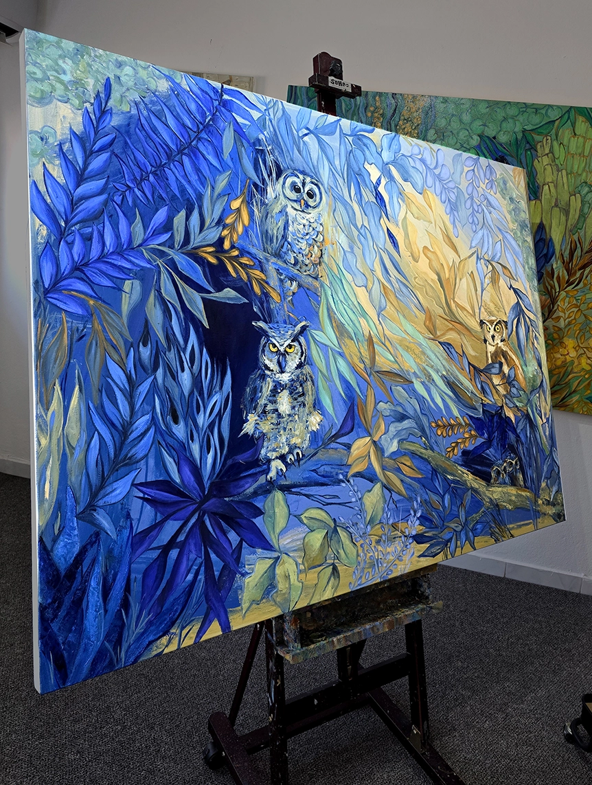 The painting captures the serenity of a night in the forest, where mysterious owls reign in their dark and silent kingdom. The foliage is depicted with leaves in contrasting dark and light tones. The overall atmosphere of the piece is calm and contemplative, evoking the tranquility of the night and the silent beauty of nature. The owls, in their silent wisdom, seem to be in perfect harmony with the environment around them, symbolizing the connection between the natural world and the mysterious realm of the night.