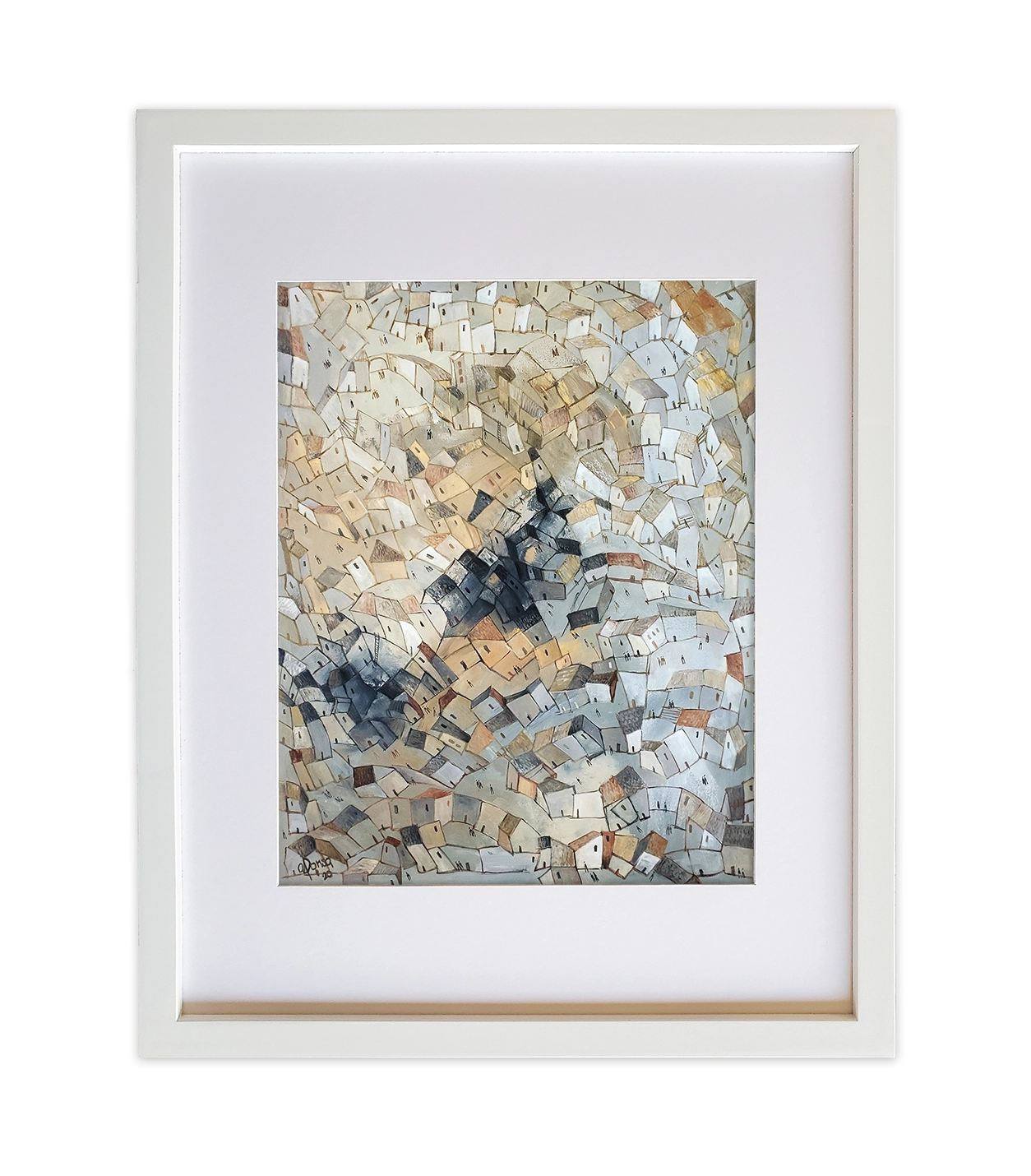 An artwork that unfolds through hidden details, waiting to be discovered: stairs leading to another dimension, pedestrians, dwellings, and more.