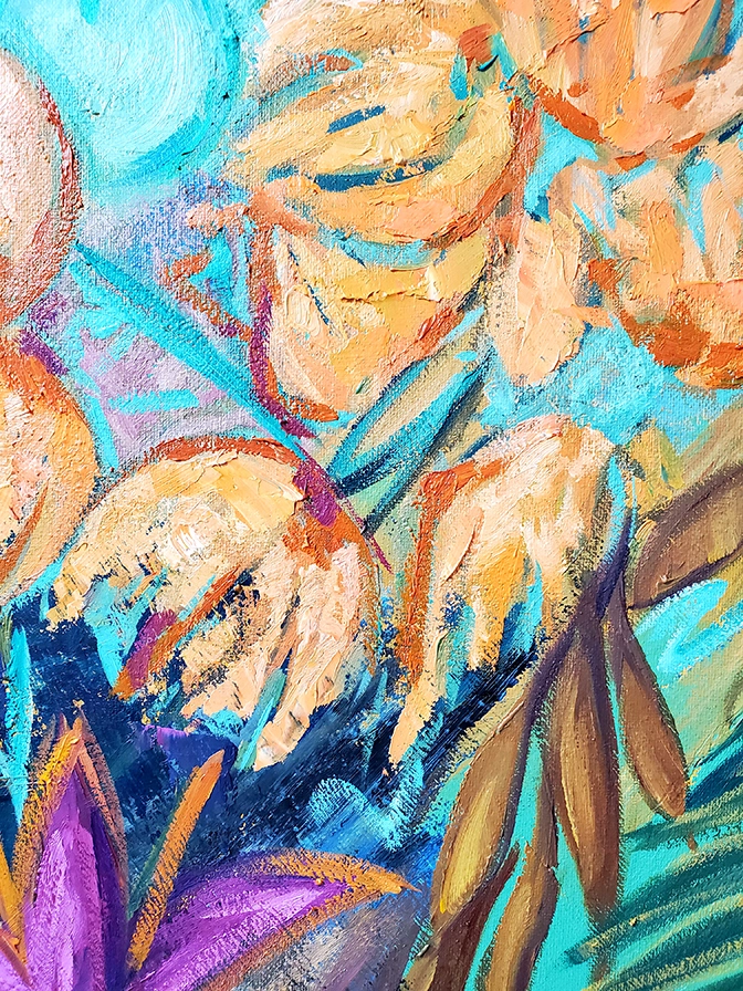 This work honors the Quetzal, a beautiful emblematic bird of Central America, greatly revered by pre-Hispanic cultures, including the great tlatoani Moctezuma, who used its feathers in ceremonial attire as a symbol of prestige and power. Its bright green and red plumage symbolize freedom and beauty. The birds are nestled in a large foliage, where they are peacefully in their habitat.