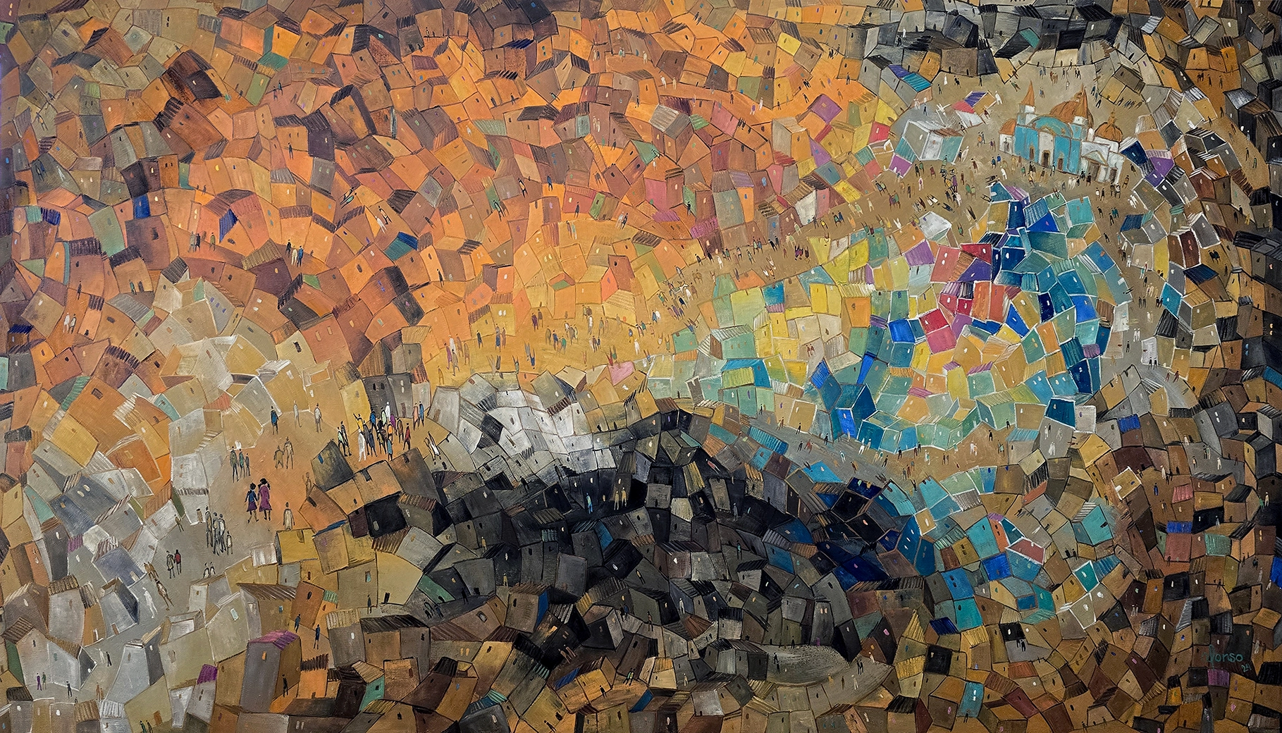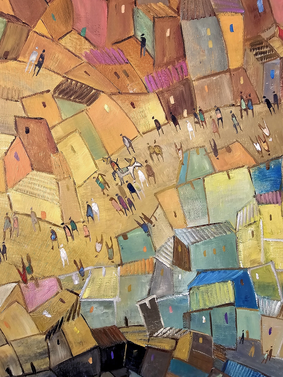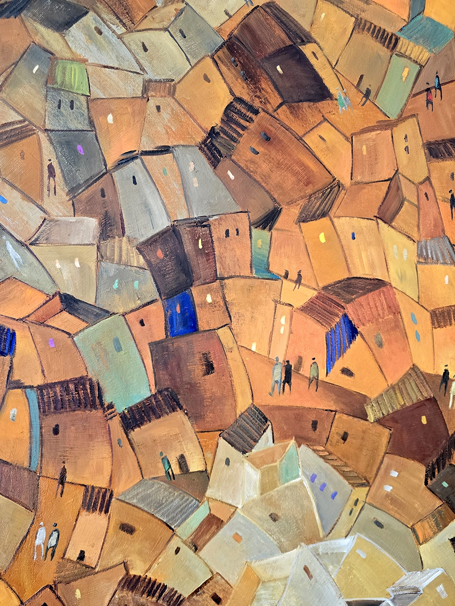 At the beginning of the journey, the houses will be larger, and two girls will be walking. As the journey progresses, the perspective shifts, and the buildings seem to shrink, with houses and structures appearing smaller.