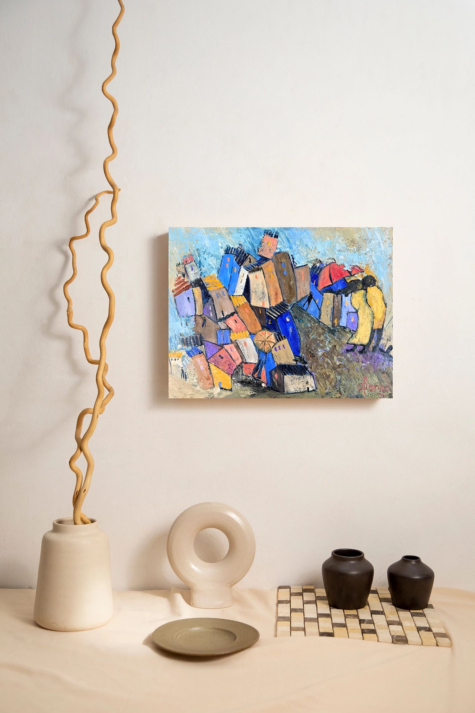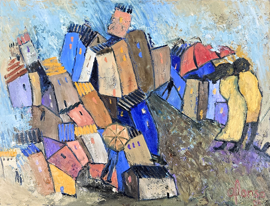 I really like rainy days; they become special because of the nostalgia and caution they harbor. In this piece, I seek to capture that atmosphere, the water falling from the sky, the wet ground, the houses fading into the rain.