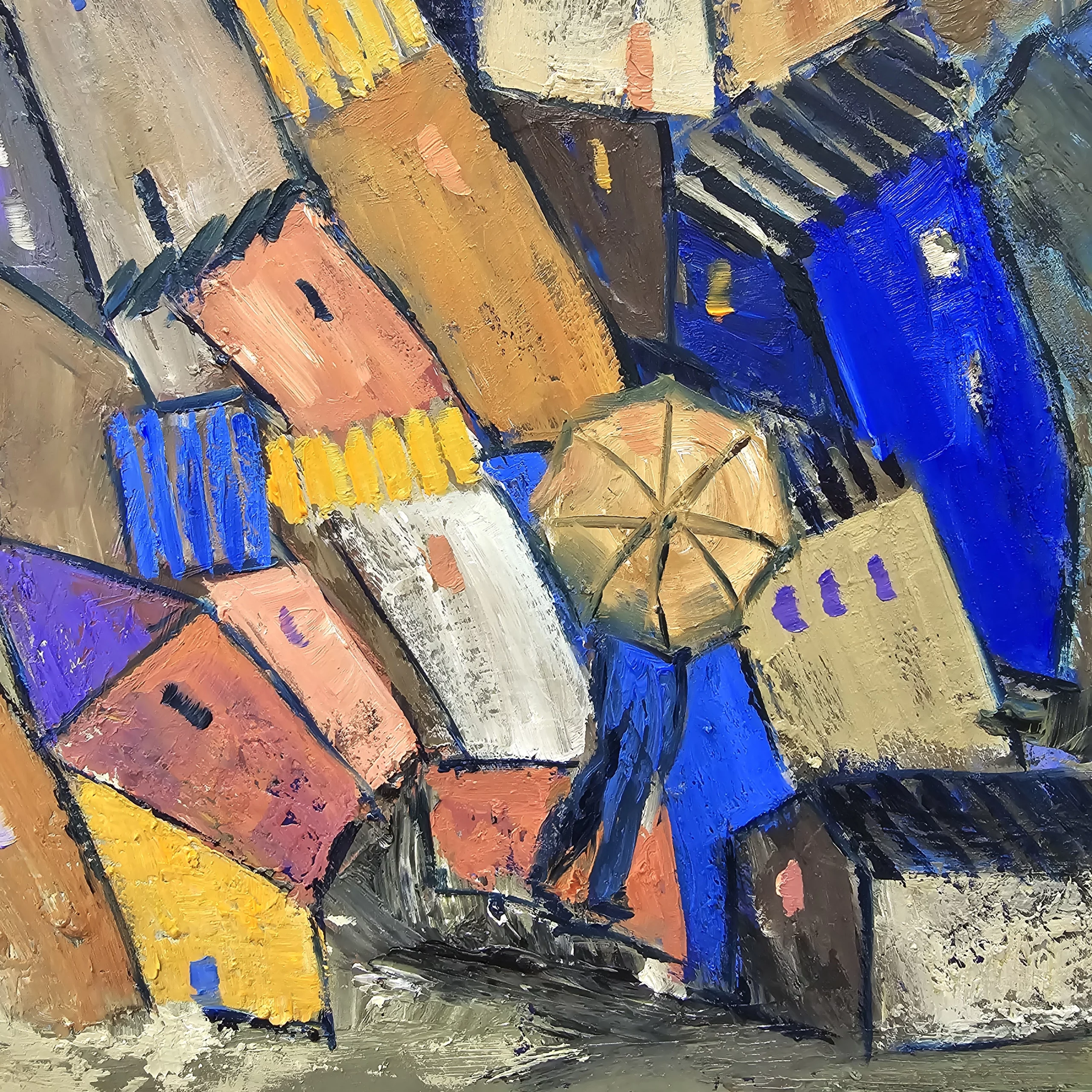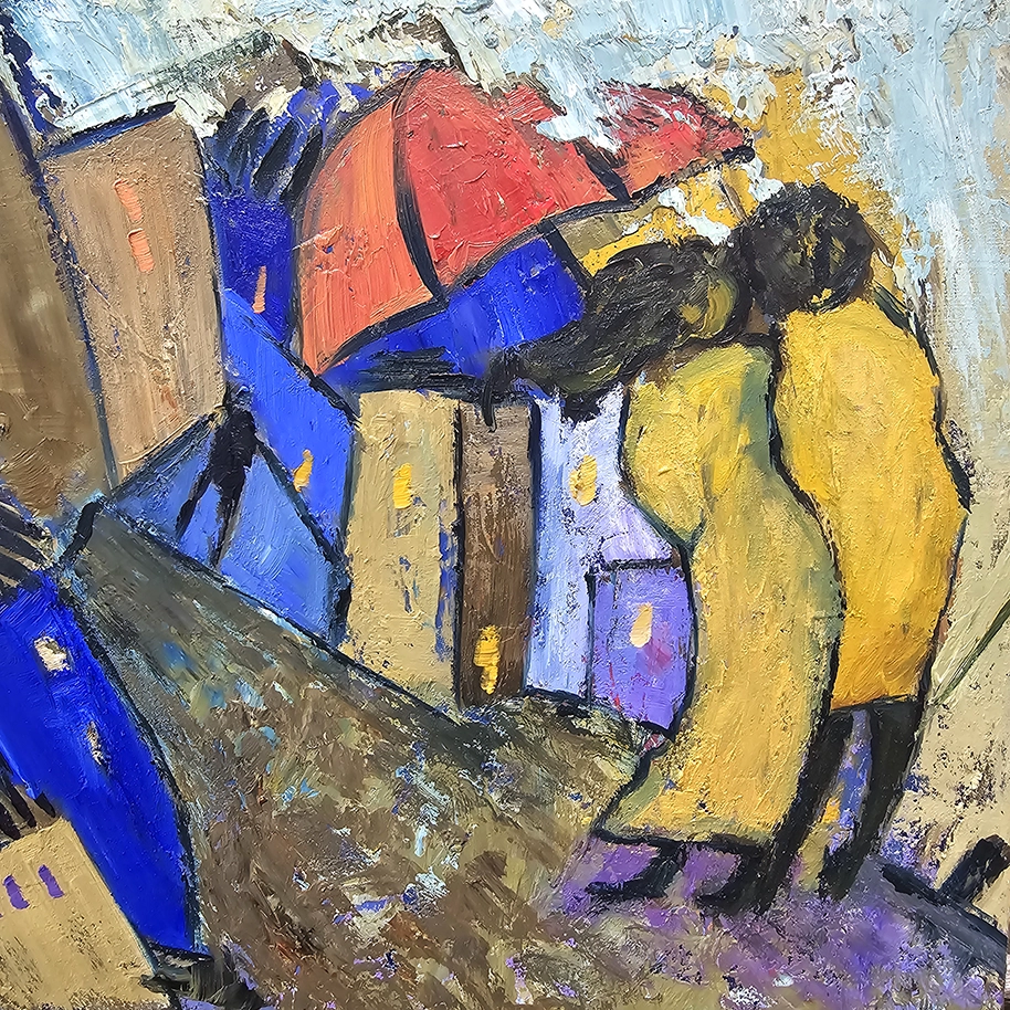 The texture of the oil stands out in the work, its reliefs, and the thickness of the paint. The piece is a representation of human connection, intimacy, and the beauty of everyday moments.