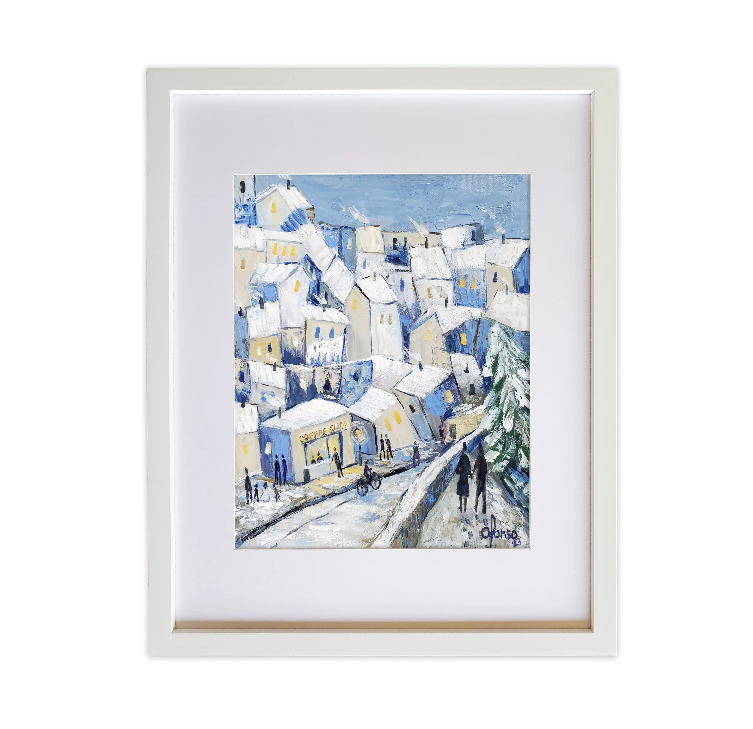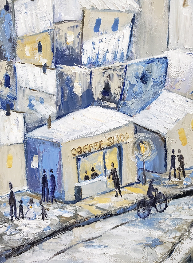 Cozy and frosty scene where a couple walks hand in hand in view of a cafeteria where many people gather to warm up from the cold. A palette of blues and whites that evoke frigid temperatures but always very pleasant for being at home in the company of loved ones and relaxing. Intimate and relaxed atmosphere, surrounded by the gentle bustle of people enjoying warmth in the midst of the cold.