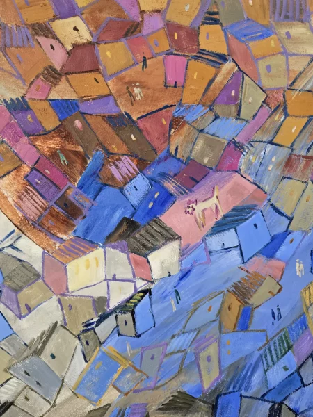 32,000.00 MXNThe artwork is a vibrant oil painting that captures the joy of a village fair. At the center, a lively crowd moves through the stalls, enjoys the games, and watches street performers. Shades of blue, green, and pink blend harmoniously in the people, banners, and market canopies, conveying dynamism and […]